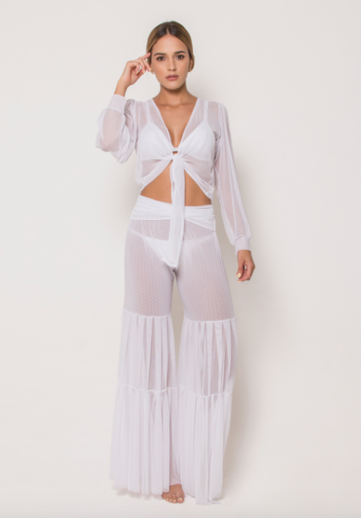 The Kiki Set comes in a see through fabric with high waisted pants.